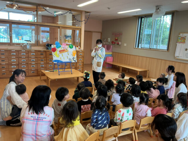 年少ぐみさんはエプロンシアター「お誕生日ケーキ」♪ 保育園部さんは「どんな色が好き?」です♪