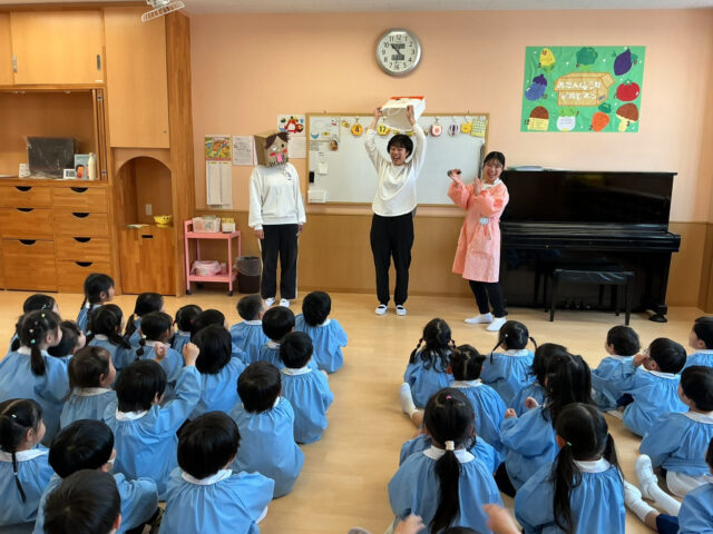 年長ぐみさんは先生による劇「みんなで王冠取り戻せ!」♪ 年中ぐみさんは「この先生は誰でしょう?」