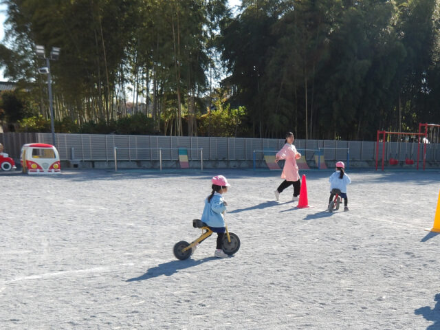 年長ぐみさん「鼓隊演奏の発表」年中ぐみさん「自転車リレーサーキット」年少ぐみさん「だるまさんが転んだ」